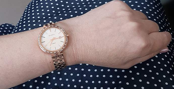Кварцевые часы выполнены из нержавеющей стали, цвет покрытия - розовое золото. Водозащита от брызг и дождя. Ремешок блестящий, звенья посередине немного матовые, выглядит симпатично. Прекрасно подходят как для повседневной носки, так и на выход.
